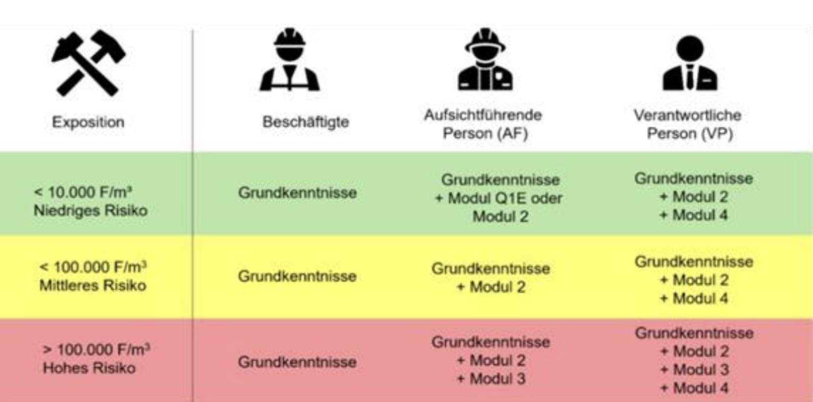 Da auch die Probeentnahme ein potenzieller Kontakt mit Asbest in Bauteilen sein kann, ist dafür grundsätzlich Fachkunde des Probenehmers und Sachkunde einer Aufsicht führenden Person erforderlich. Denkbar ist aber auch, dass der Probenehmer selbst die Sachkunde einer Aufsicht führenden Person besitzt. Sachkunde kann zum Beispiel im Rahmen einer Schulung nach Anlage 4 C der TRGS 519 (sogenannter „kleiner Asbestschein“) erlangt wer den. In zwei Tagen (mit 17 Lerneinheiten à 45 Minuten) wird die Sachkunde vermittelt, die im Anschluss durch eine Prüfung nachgewiesen wird. Diese erlangte Sachkunde behält sechs Jahre Gültigkeit und ist auch in dem neuen modularen Qualifikationssystem als gleichwertig anerkannt im Bereich niedrigen und mittleren Risikos. Für die Probenahme selbst gibt es von der DGUV anerkannte „emissionsarme Verfahren“ wie BT 31 („Stanzverfahren mit Schleuse“ zum Beispiel für die Entnahme von Putzproben) und BT 32 („Ausstemmen mittels Stemm schleuse“), die dem Bereich niedrigen Risikos (weniger als 10.000 Asbestfasern pro Kubik meter Luft) zugeordnet werden. Eine Person mit „kleinem Asbestschein“ besitzt die Sachkunde, die die aufsichtführende Person vor Ort und die verantwortliche Person für derartige Beprobungen im Betrieb benötigt. Die aufsichtführende Person kann auch als verantwortliche Person benannt werden, das heißt beide Rollen übernehmen, und selbst Proben entnehmen. Aufgrund der erworbenen Sachkunde sind Personen auch mit kleinem Schein in der Lage, den Risikobereich abzuschätzen und gegebenenfalls Experten hinzuzuziehen, wenn ihre Qualifikation nicht ausreicht. Im hohen Risikobereich beispielsweise ist Sachkunde nach An lage 3 (sogenannter „großer Asbestschein“) erforderlich. Das ist beispielsweise bei Spritzas best oder Cushioned-Vinyl der Fall, wenn ein sehr hoher Asbestanteil, schwach gebunden, eine hohe Faserkonzentration von 100.000 Fasern pro Kubikmeter Luft und mehr erwarten lässt. Das künftige modulare Qualifikationssystem, das mit der neuen TRGS 519, die voraus sichtlich Ende 2026/2027 veröffentlicht werden soll, baut auf unterschiedlichen Modulen auf, ist aber nach Anzahl der Lerneinheiten insgesamt deutlich aufwändiger. Im niedrigen Risikobereich werden für aufsichtführende Personen in zusammenfassenden Kombikursen beispielsweise mindestens 22,5 LE + Prüfung, für Verantwortliche mindestens 30 LE + Prüfung erforderlich.